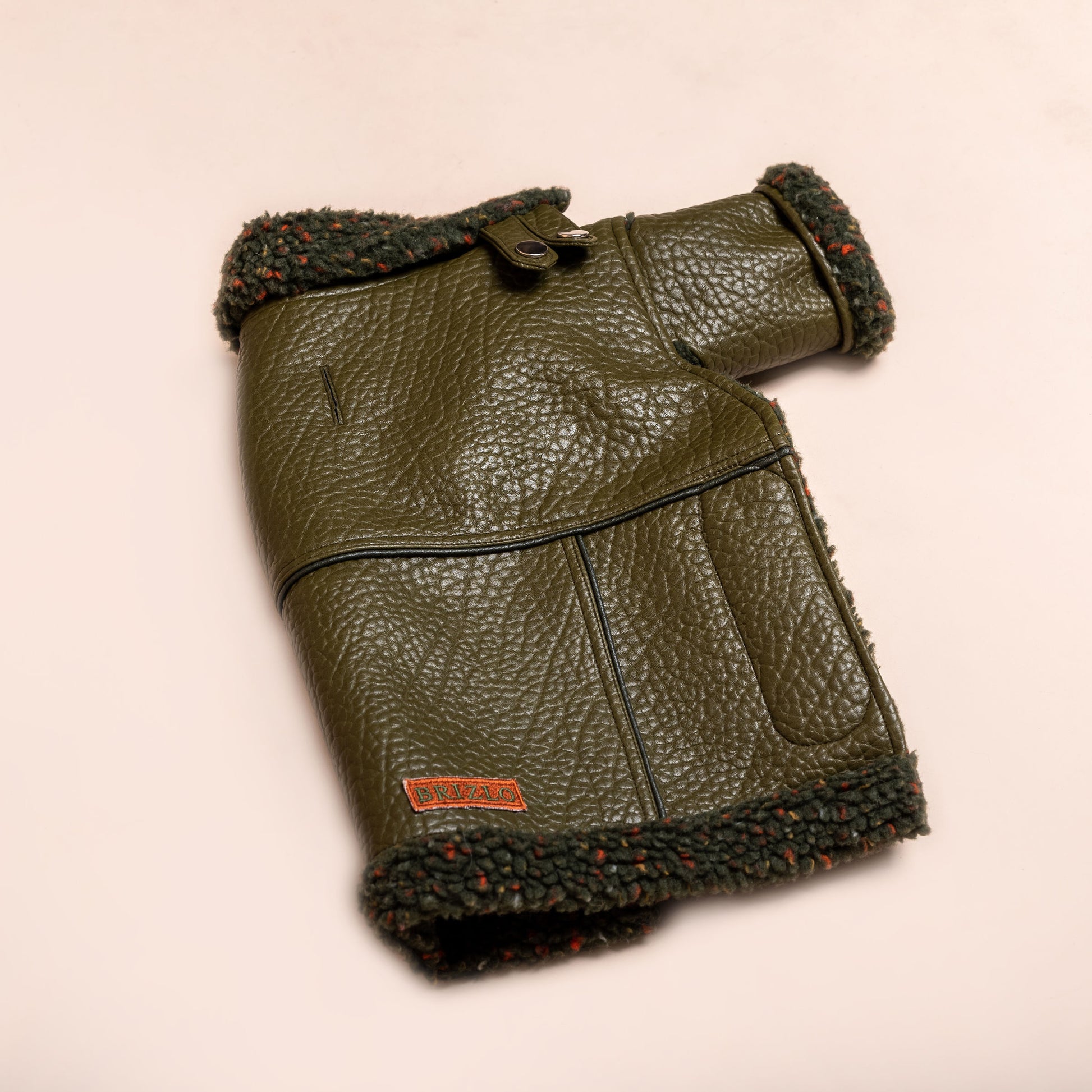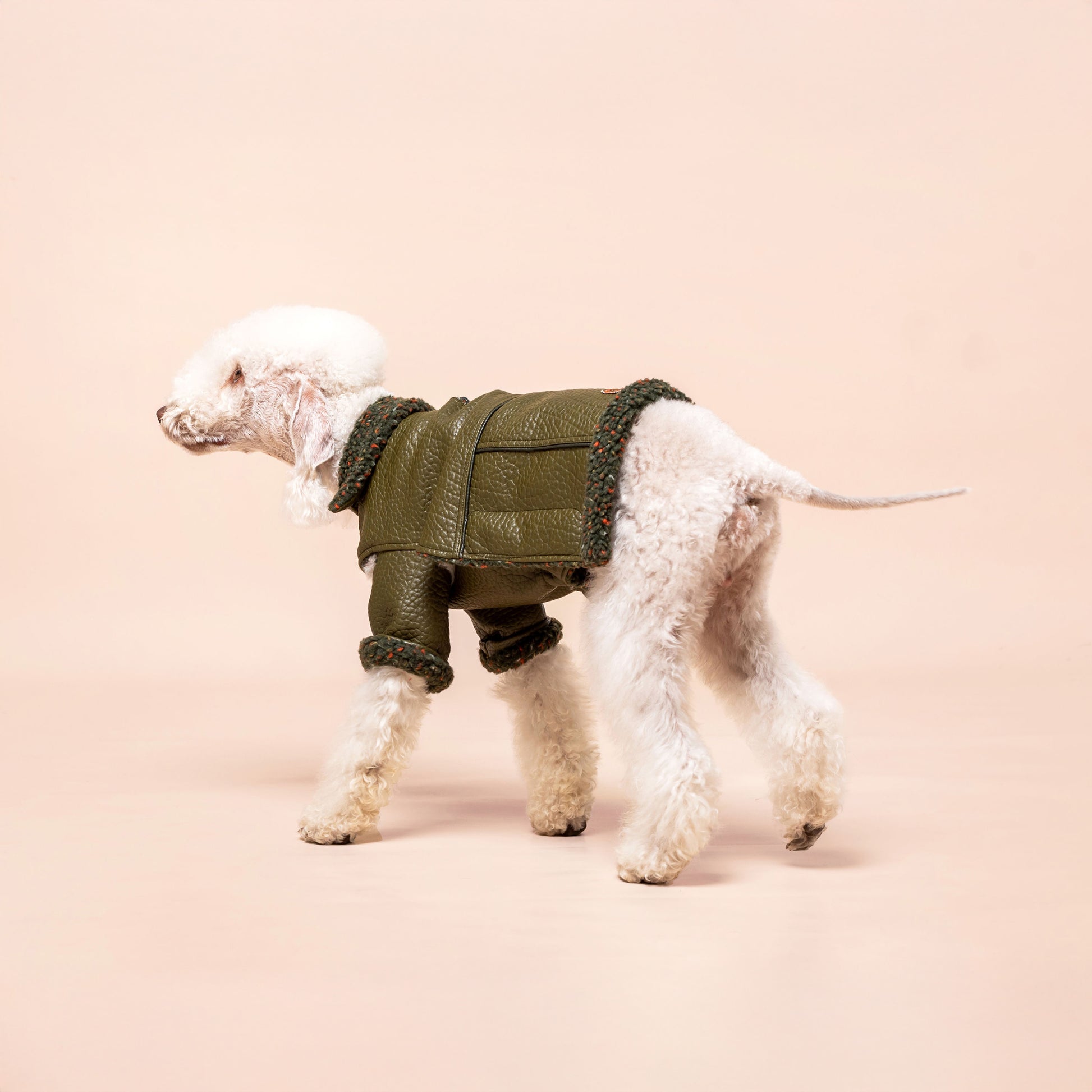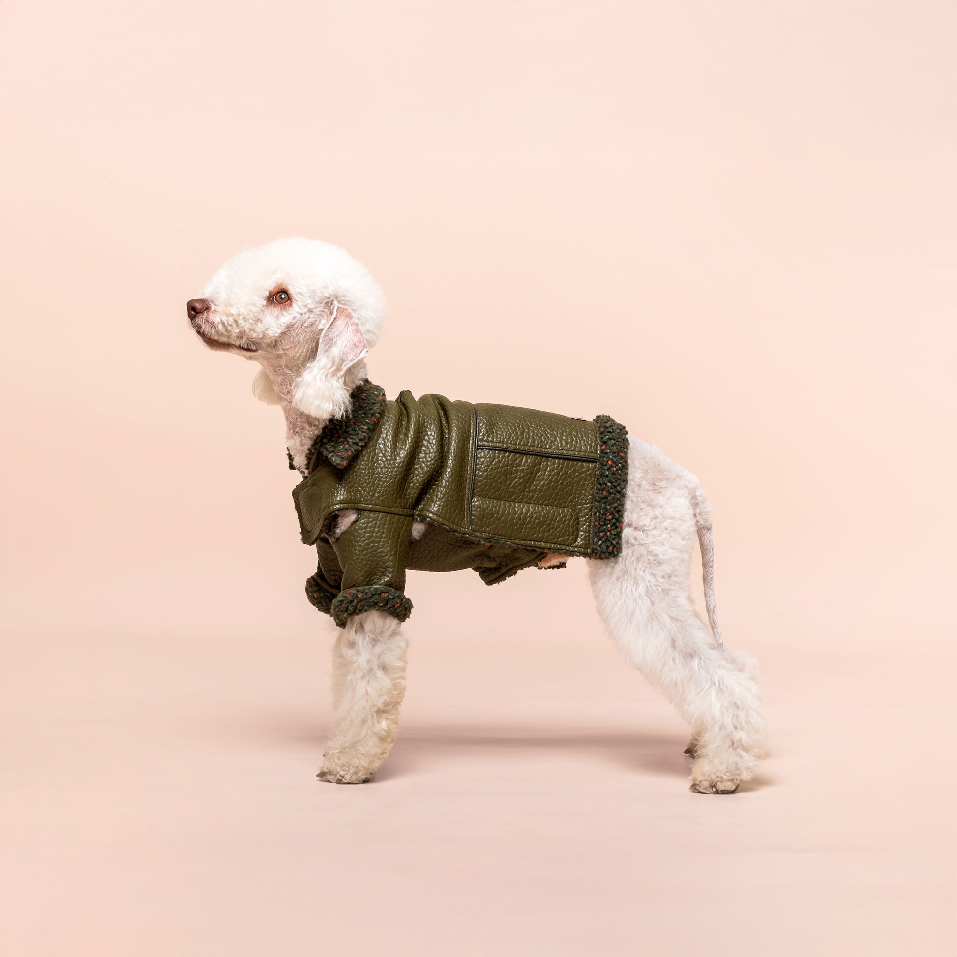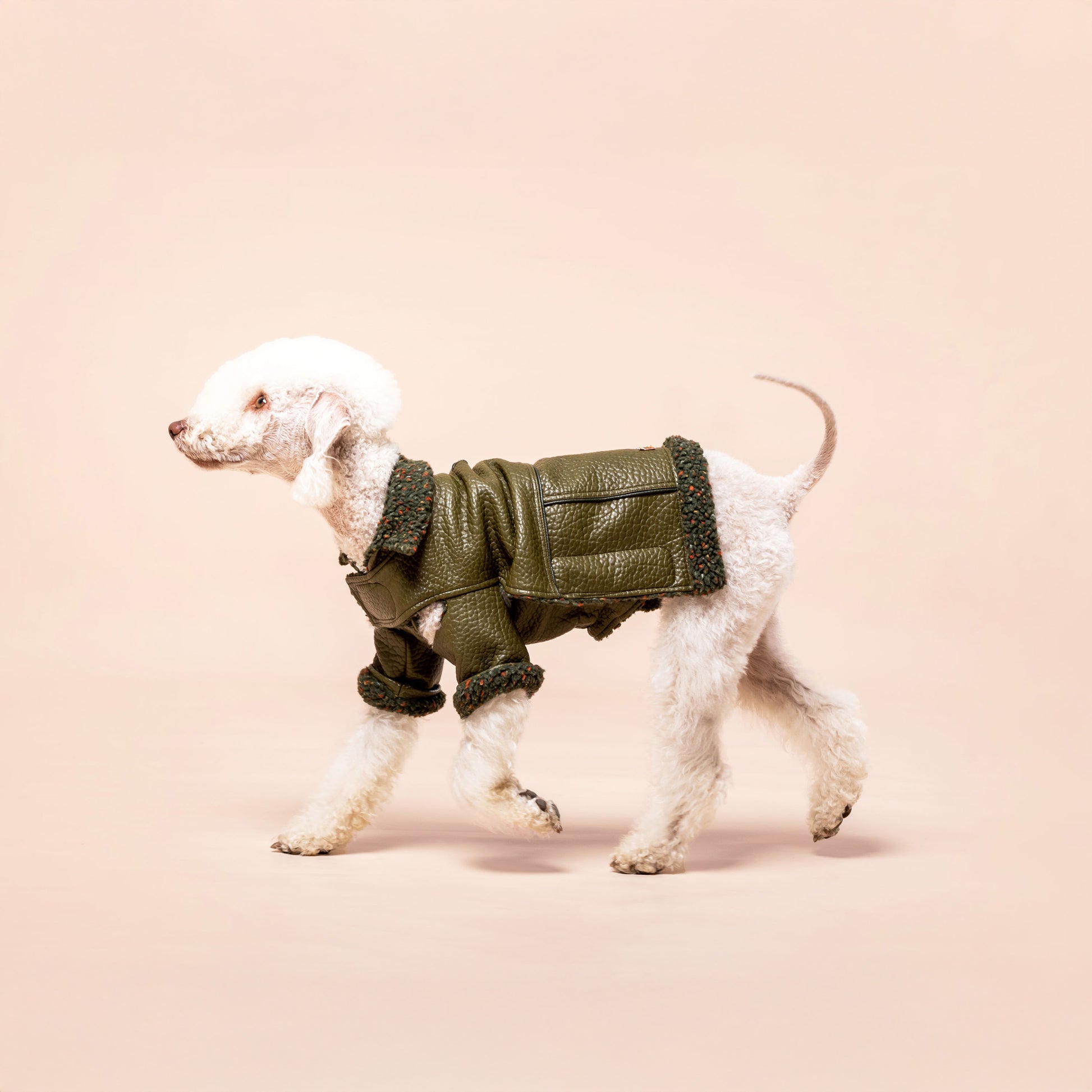 A Rider kabát a városi kutya-divat ikonja: merész, karakteres és végtelenül stílusos. Az olajzöld, strukturált műbőr borítás klasszikus motoros hangulatot idéz, amelyet a kontrasztos, bolyhos belső bélés tesz igazán különlegessé – melegen ölel, mégis könnyed marad.