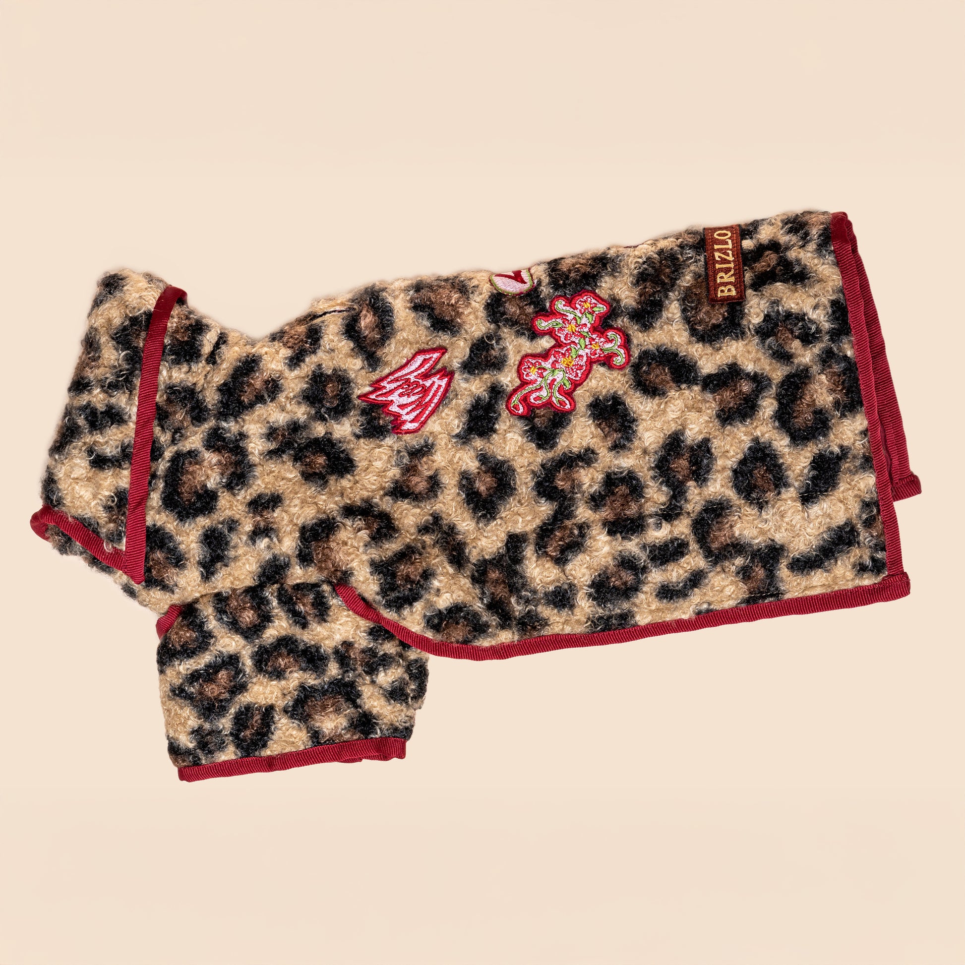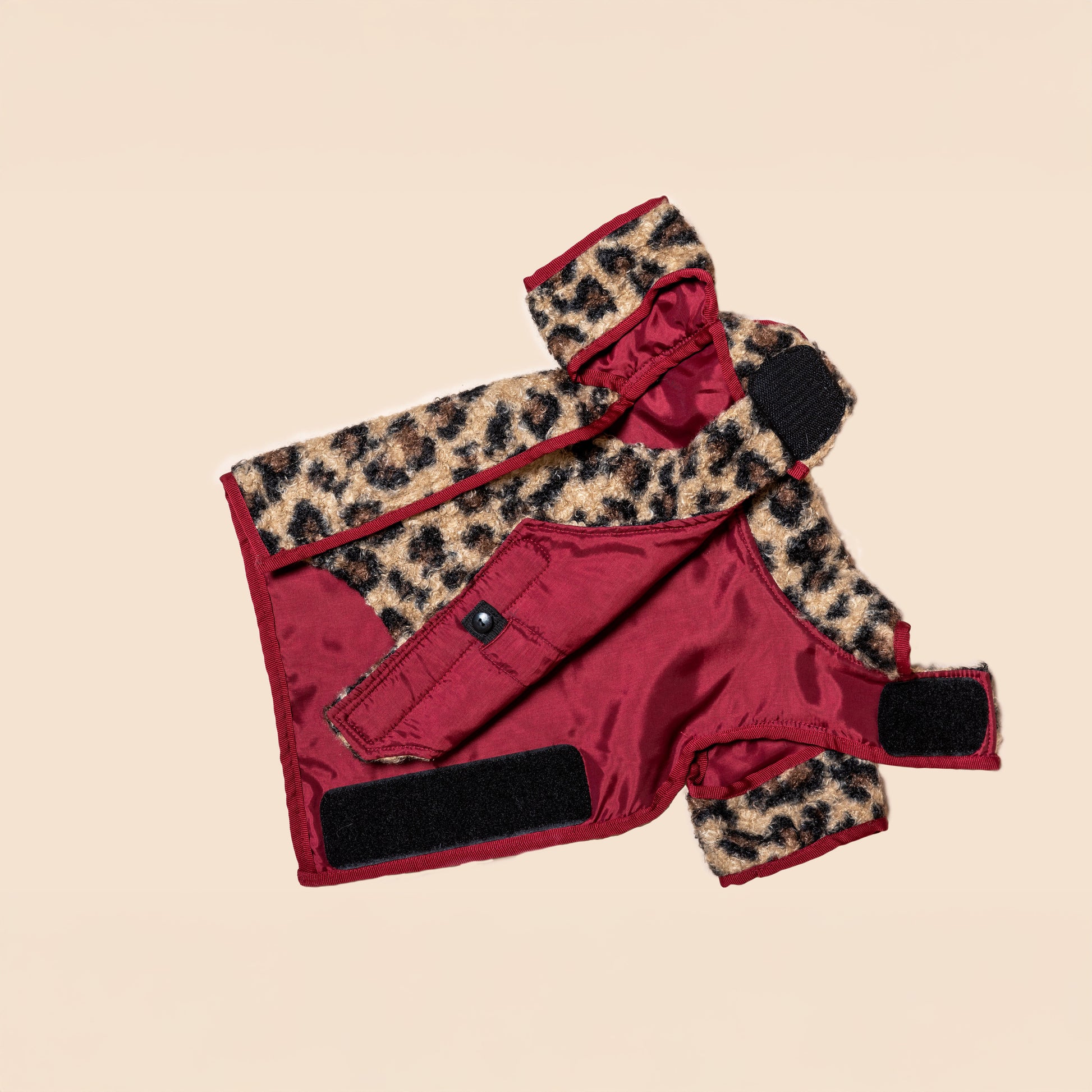 A Wild teddy kabát a Wild Cherry kollekció egyik legkarakteresebb darabja, amely a bátor és vagány négylábúak számára készült, akik szeretnek kitűnni a tömegből. A leopárdminta merész, mégis stílusos megjelenést kölcsönöz, amely minden sétán garantáltan vonzza a tekinteteket. A bordó szegély és a hímzett részletek különleges karaktert adnak a darabnak, így egyszerre sugároz eleganciát és játékosságot.
