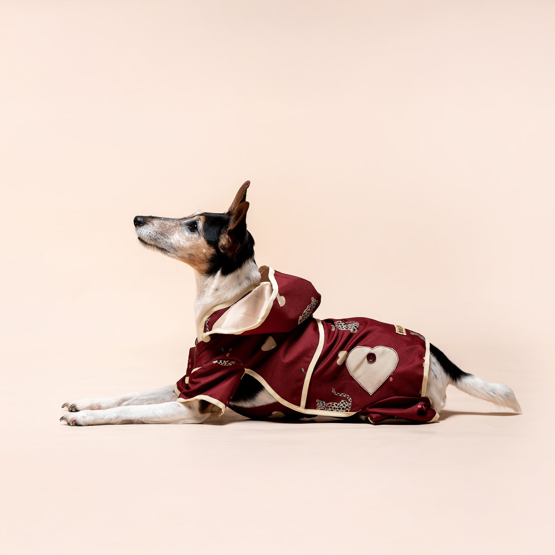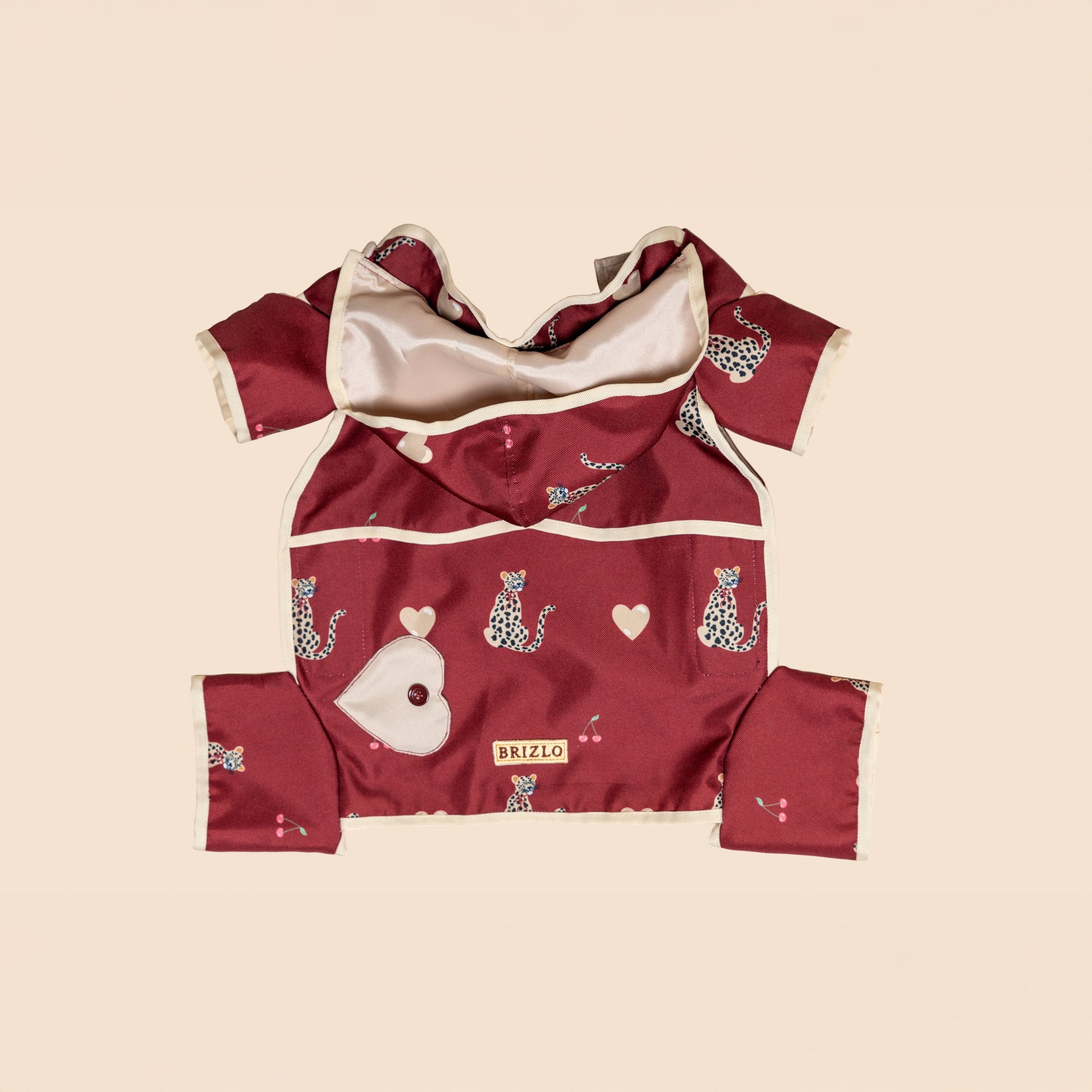 A Wild Heart esőkabát a Wild Cherry kollekció különleges darabja, amely játékos és mégis elegáns megjelenésével azonnal magára vonja a figyelmet. A mély bordó alapszín, a szív- és leopárdminta, valamint a világos szegélyek karakteres, ugyanakkor finom összhangot alkotnak, így a kabát egyszerre bájos és stílusos választás minden négylábú számára.